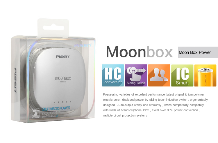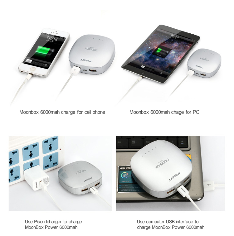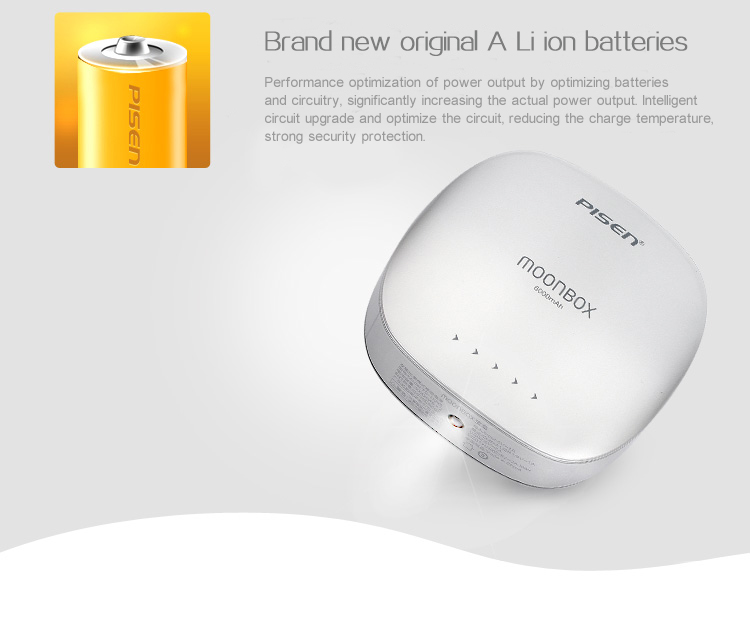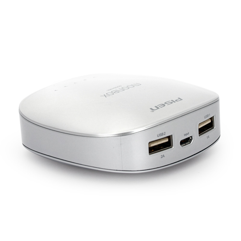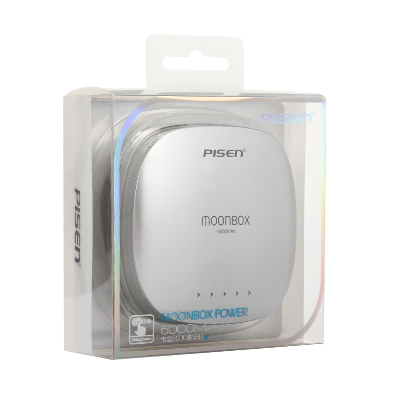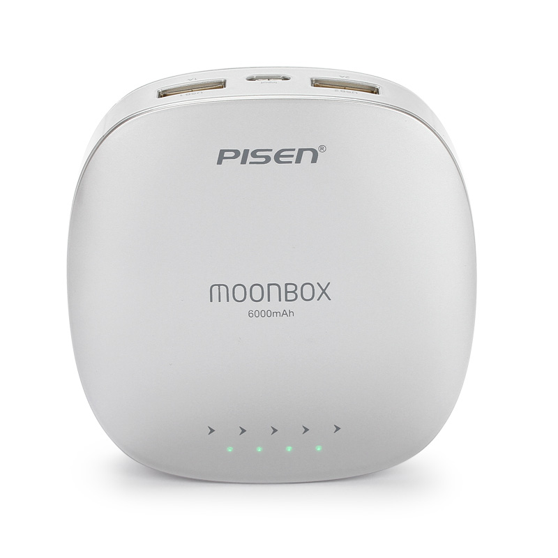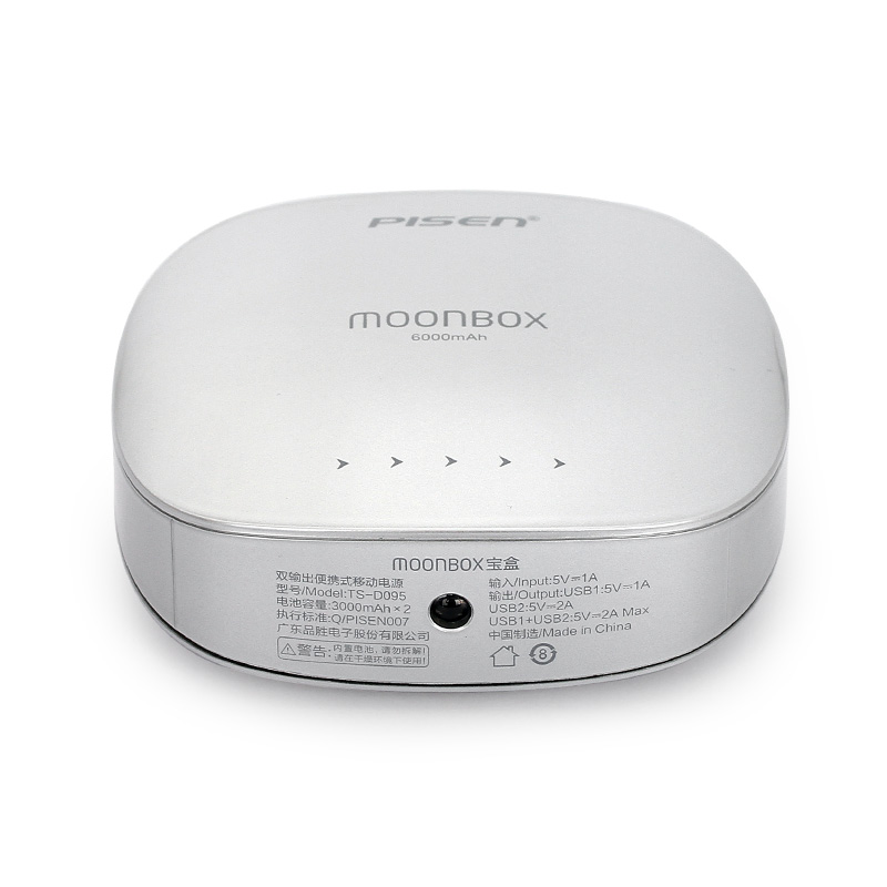 PISEN แบตสำรองแท้ 6,000 mAh พาวเวอร์แบงค์ 2 USB 5V-2A Moon Box Power รุ่น TS-D095 ปุ่มสัมผัสแบบสไลด์ ไฟฉาย LED ส่องสว่างยามค่ำคืนในตัว เก็บประจุเต็มที่ได้ยาวนาน รูปทรงโค้งมน ขนาดกระทัดรัดจับถนัดกระชับมือ - สีเงิน