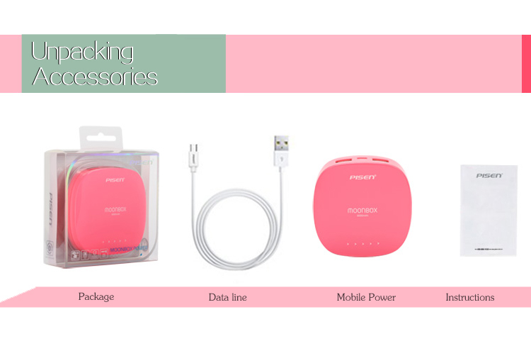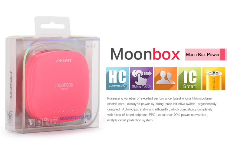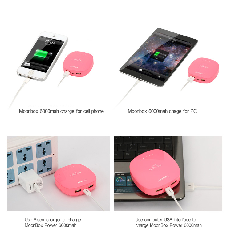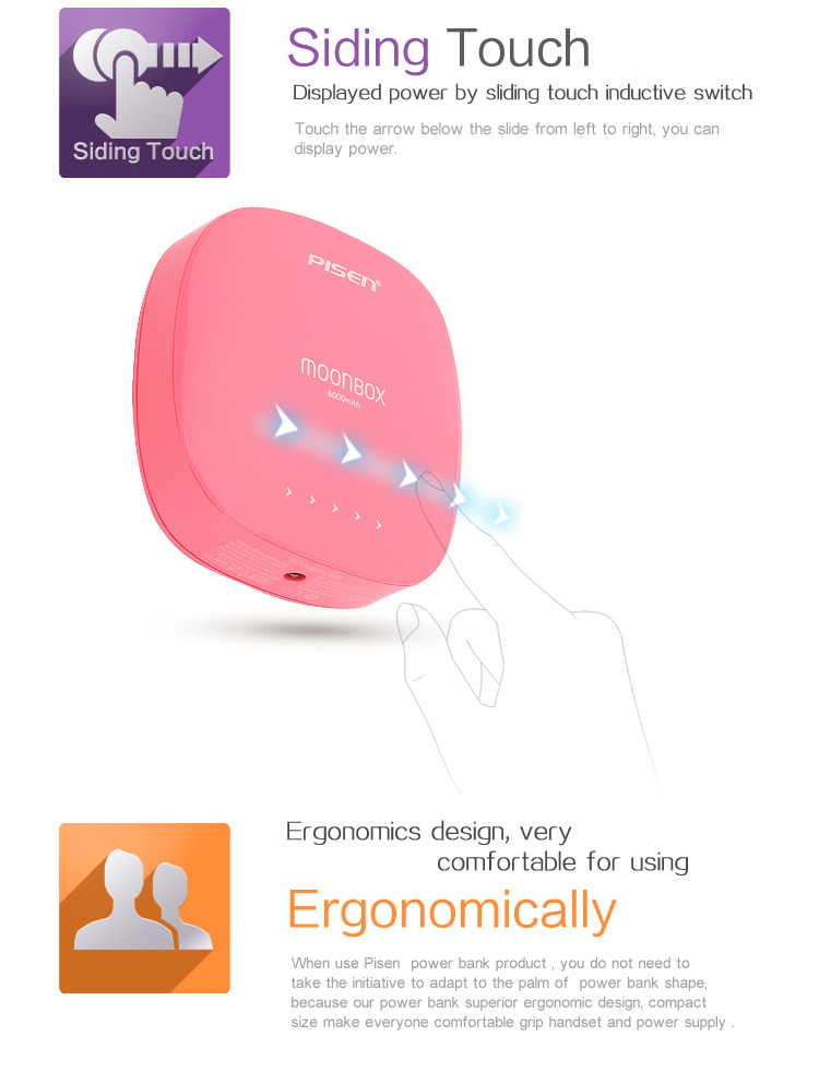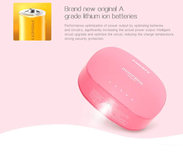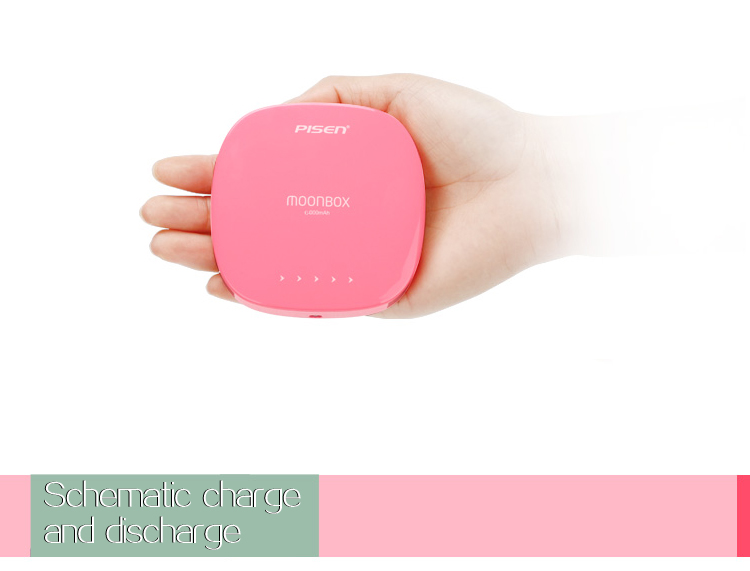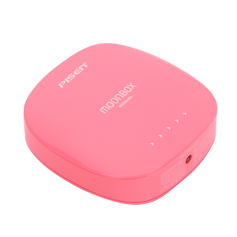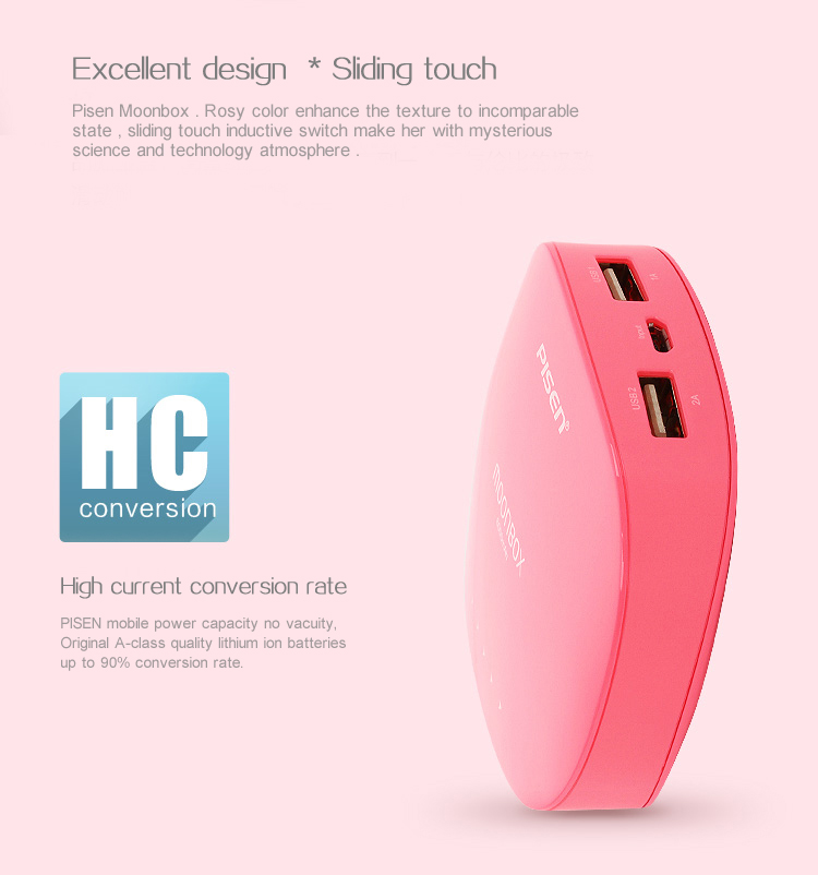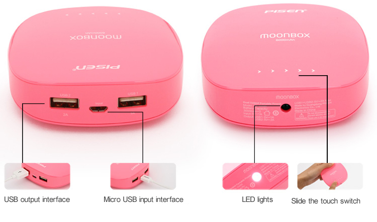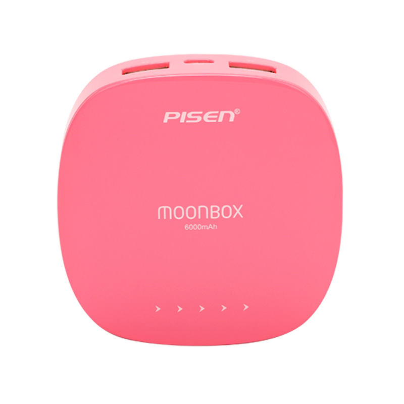 PISEN แบตสำรองแท้ 6,000 mAh พาวเวอร์แบงค์ 2 USB 5V-2A Moon Box Power รุ่น TS-D095 ปุ่มสัมผัสแบบสไลด์ ไฟฉาย LED ส่องสว่างยามค่ำคืนในตัว เก็บประจุเต็มที่ได้ยาวนาน รูปทรงโค้งมน ขนาดกระทัดรัดจับถนัดกระชับมือ – สีชมพู