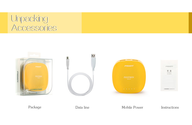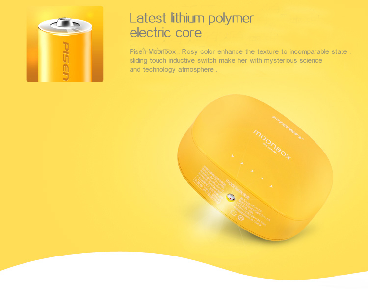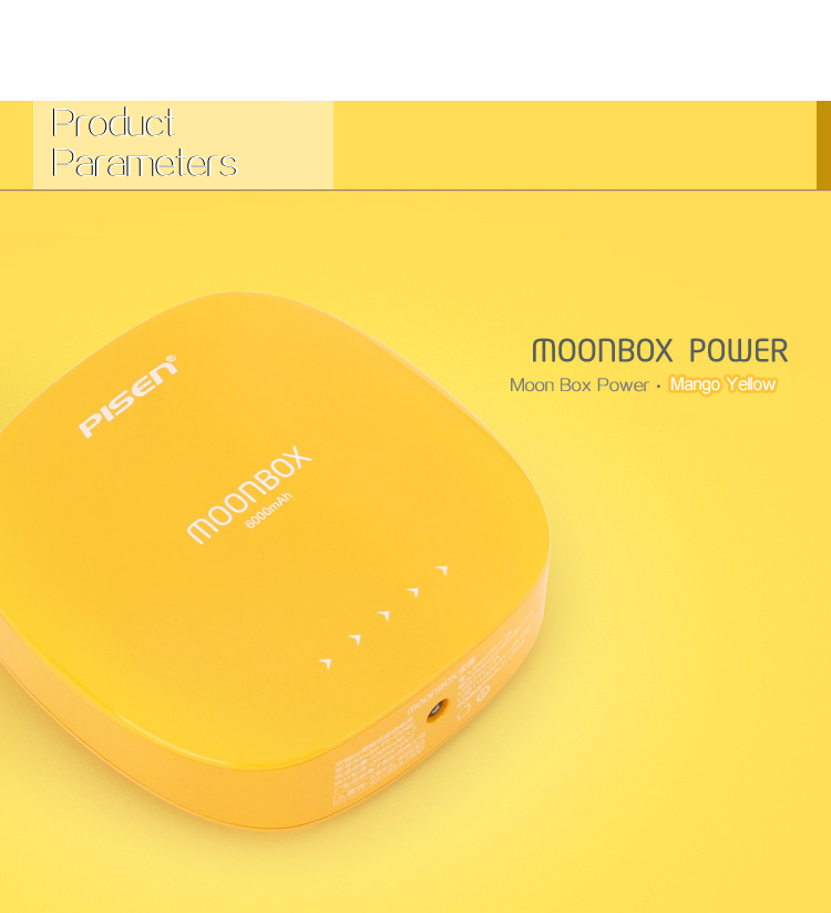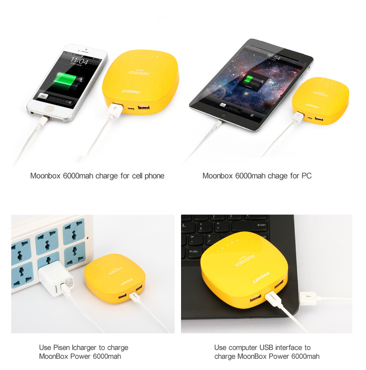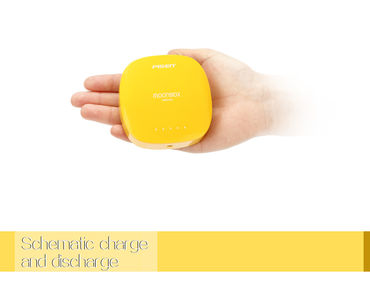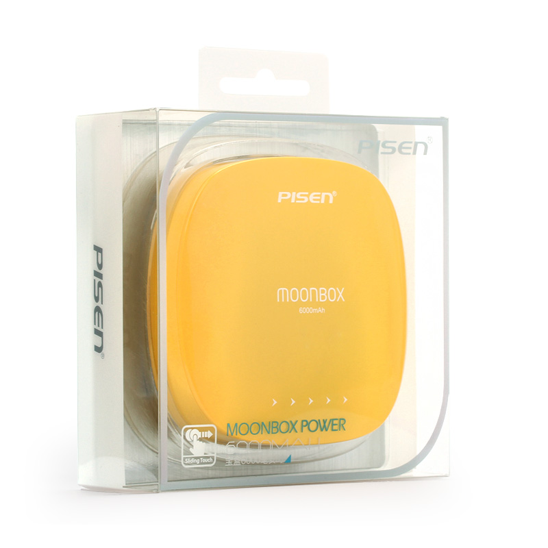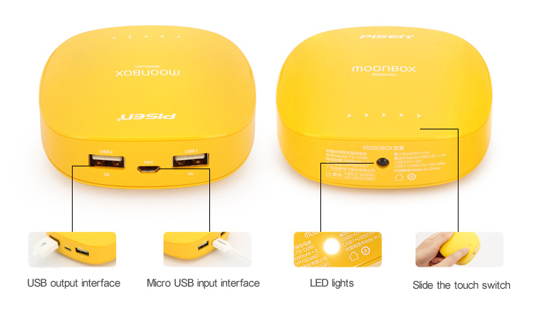 PISEN แบตสำรองแท้ 6,000 mAh พาวเวอร์แบงค์ 2 USB 5V-2A Moon Box Power รุ่น TS-D095 ปุ่มสัมผัสแบบสไลด์ ไฟฉาย LED ส่องสว่างยามค่ำคืนในตัว เก็บประจุเต็มที่ได้ยาวนาน รูปทรงโค้งมน ขนาดกระทัดรัดจับถนัดกระชับมือ – สีเหลือง