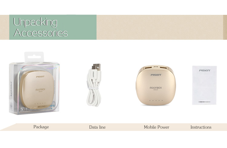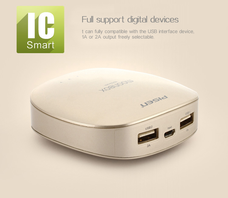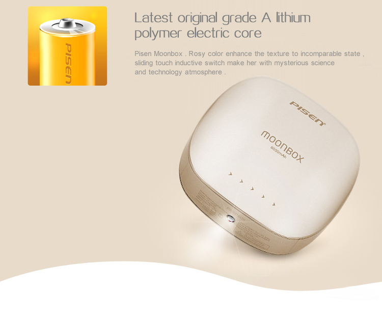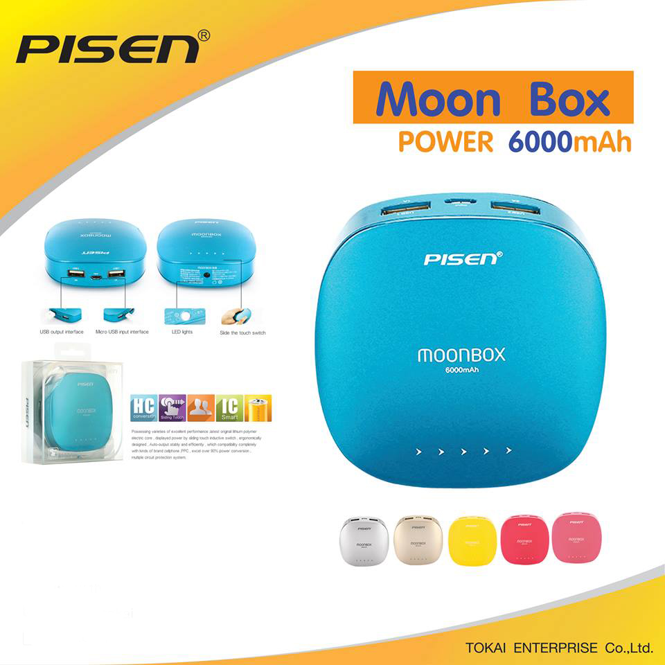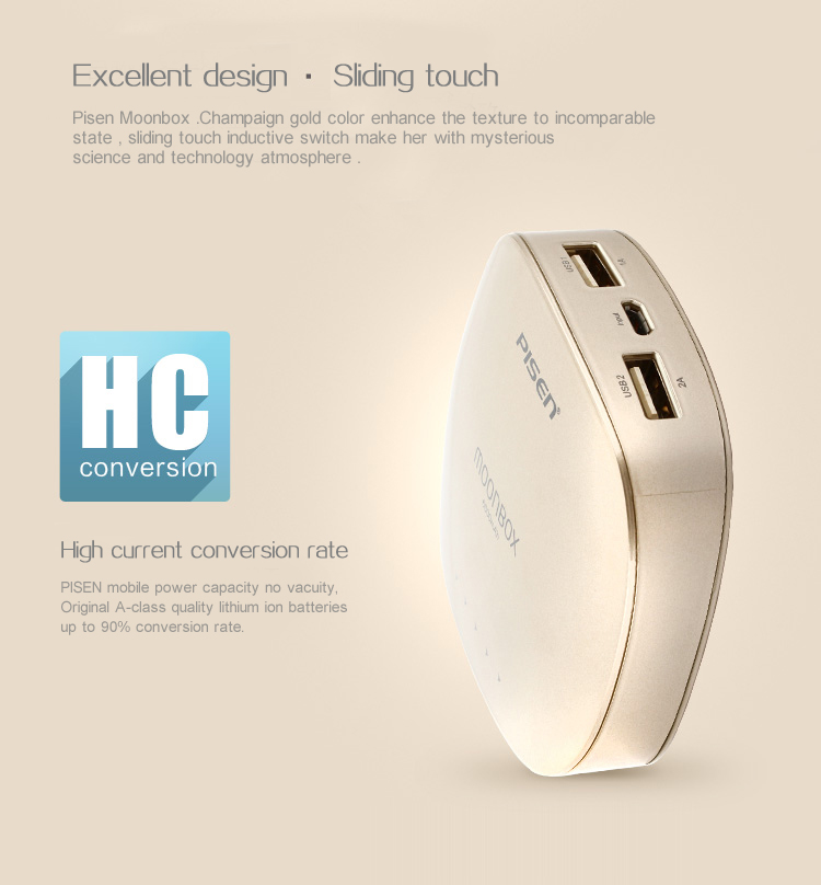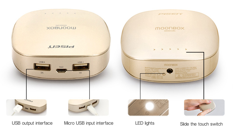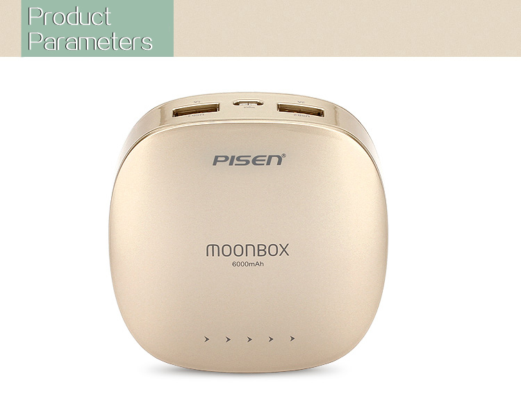 PISEN แบตสำรองแท้ 6,000 mAh พาวเวอร์แบงค์ 2 USB 5V-2A Moon Box Power รุ่น TS-D095 ปุ่มสัมผัสแบบสไลด์ ไฟฉาย LED ส่องสว่างยามค่ำคืนในตัว เก็บประจุเต็มที่ได้ยาวนาน รูปทรงโค้งมน ขนาดกระทัดรัดจับถนัดกระชับมือ - สีทองคำ