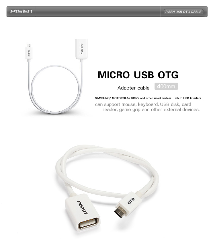 ใหม่!!! PISEN สาย OTG ถ่ายโอนข้อมูล ผ่าน USB ได้ทุกทีทุกเวลา ความยาว 400 mm.(มิลลิเมตร) แรงดันไฟฟ้าสูง ทนความร้อน อินเตอร์เฟส USB 2.0 และ Micro USB พอร์ตมาตรฐานใช้งานได้กับ USB ทุกรุ่น การออกแบบบุ๋มบนพื้นผิวช่วยให้มั่นใจว่าจุดเชื่อมต่อที่ดีที่สุดกับตัวเชื่อมต่ออะแดปเตอร์ การออกแบบที่แฟชั่น ขนาดกะทัดรัดสายอ่อนยืดหยุ่น แข็งแรงทนทาน เทคโนโลยี Terminal Gilding ได้รับการรับรองการผลิตตามมาตรฐานญี่ปุ่น ผลิตโดยชิ้นส่วนและวัสดุคุณภาพสูง ให้พลังงานสูงและมีเสถียรภาพตลอดการชาร์จ แรงดีไม่มีตก ออกแบบพิเศษสำหรับผลิตภัณฑ์สมาร์ทโฟนโดยเฉพาะ หมดปัญหาการใช้งานจุกจิก ใช้งานได้กับ Smart Phone และ Tablet ทั่วไป แข็งแรงทนทานใช้งานได้ยาวนาน ประหยุด คุ้มค่า คุ้มราคา