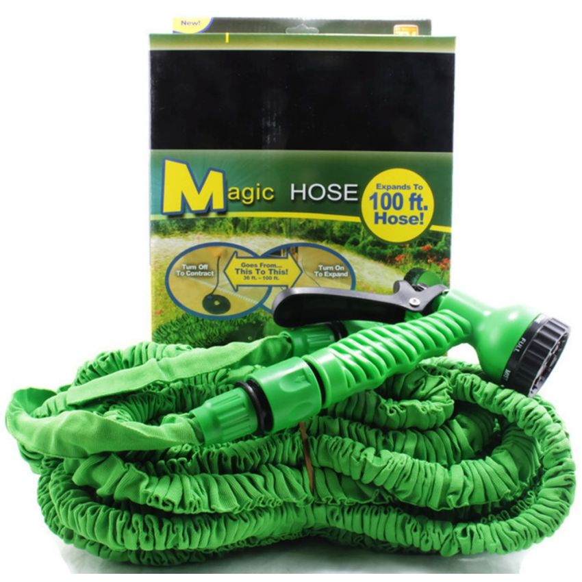 Magic Hose สายยางยืดหด พร้อมหัวฉีด 7 ระดับ ขนาด 100 ฟุต เป็นการออกแบบที่ทำให้สายยางสามารถยึดออกมาได้มากถึง 3 เท่า คือ 100 ฟุต หรือ 7.5 เมตร มีน้ำหนักเบา หมดปัญหาเรื่องสายยางพับงอ และพันกัน สะดวกต่อการม้วนเก็บเมื่อไม่ใช้งาน