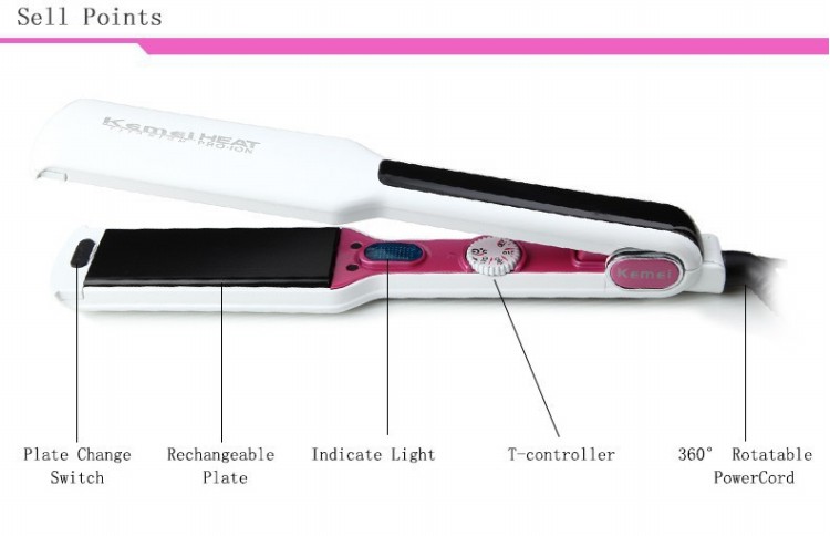 แผ่นความร้อนผลิตจากเหล็กไททาเนี่ยม 100% การออกแบบแผ่นที่มุมโค้งมนและมีแผ่นไฮบริดที่มีความยืดหยุ่นซึ่งช่วยป้องกันเส้นผมไม่ให้ติดขัดโดยไม่คำนึงถึงเทคนิคการจัดแต่งทรงผมของช่างทำผมมือาชีพ แผ่นลอนหยัก หยักเล็ก หยักละเอียด