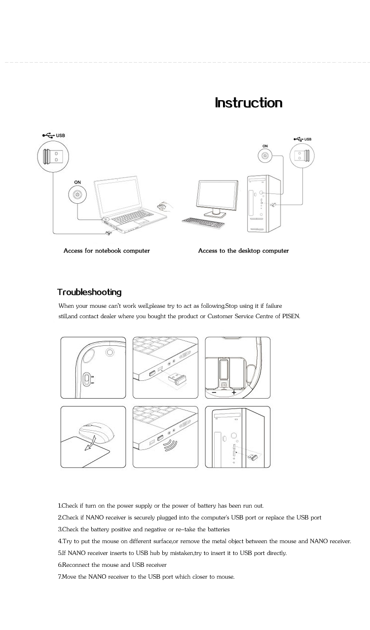 เมื่อเมาส์ของคุณไม่สามารถใช้งานได้ดี โปรดลองทำตามดังต่อไปนี้ หยุดใช้และตรวจสอบความถูกต้อง หากยังใช้งานไม่ได้ ติดต่อตัวแทนจำหน่าย ที่คุณซื้อผลิตภัณฑ์หรือศูนย์บริการลูกค้าของ PISEN