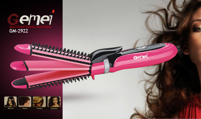 Gemei เครื่องหนีบ & ม้วนผม 3 in 1 แผ่นความร้อนทัวร์มาลีนเซรามิก GM-2922 ร้อนเร็วและนาน อุณหภูมิคงที่ สูงสุด 220 องศา กำลังไฟ 45 วัตต์ หนีบตรง หยัก ลอน พร้อมซีกแปรงหวี สายไฟใหญ่ยาวมีห่วงคล้อง – สีชมพู