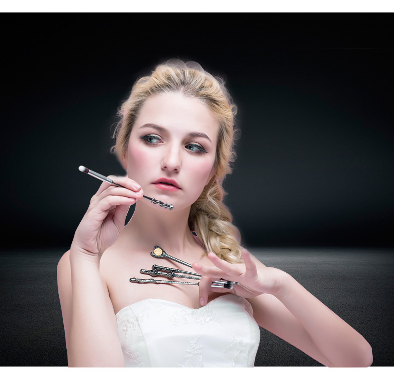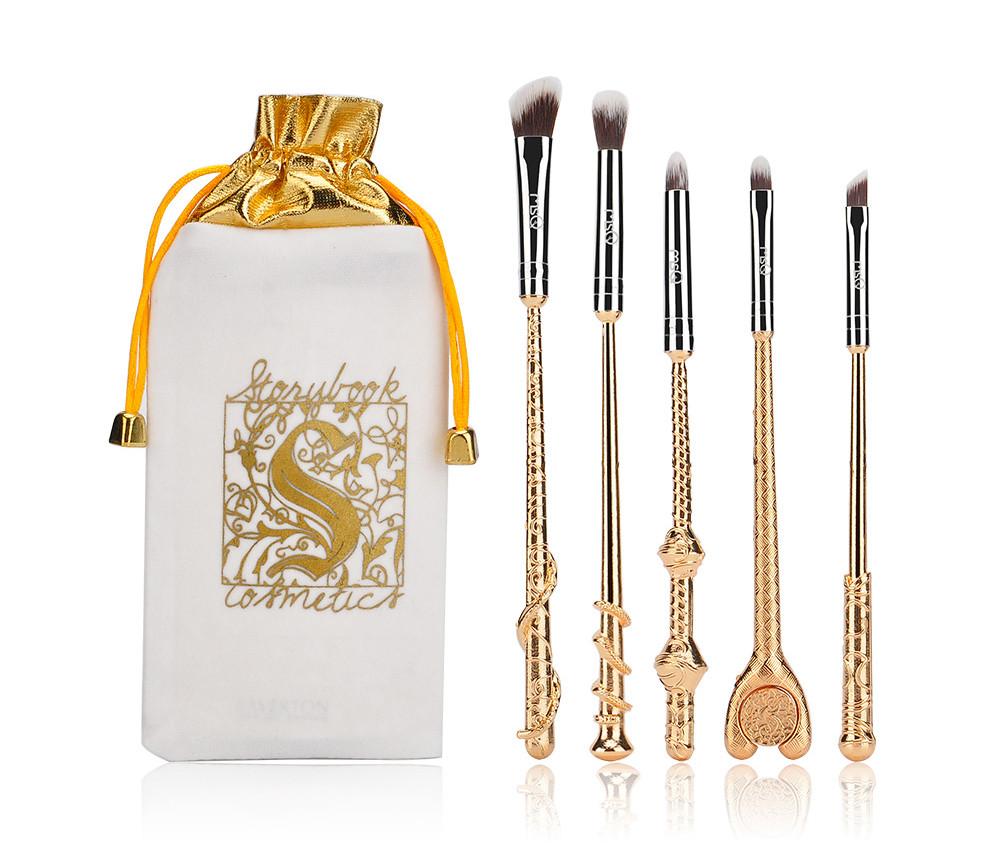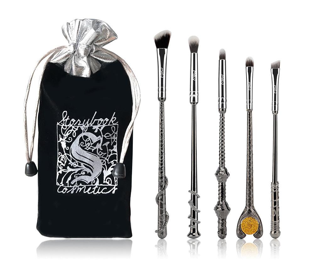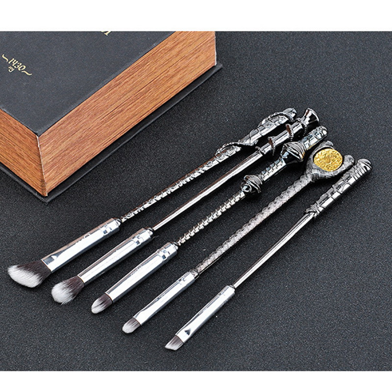 Lady Q ชุดแฮร์รี่พอตเตอร์ แปรงแต่งหน้า 5 ชิ้น ST05S แปรงปัดแก้ม แปรงรองพื้น อายแชโดว์ อายไลเนอร์ คอนซีลเลอร์ ด้ามโลหะ พร้อมถุงผ้าวิเศษ - สีเงิน